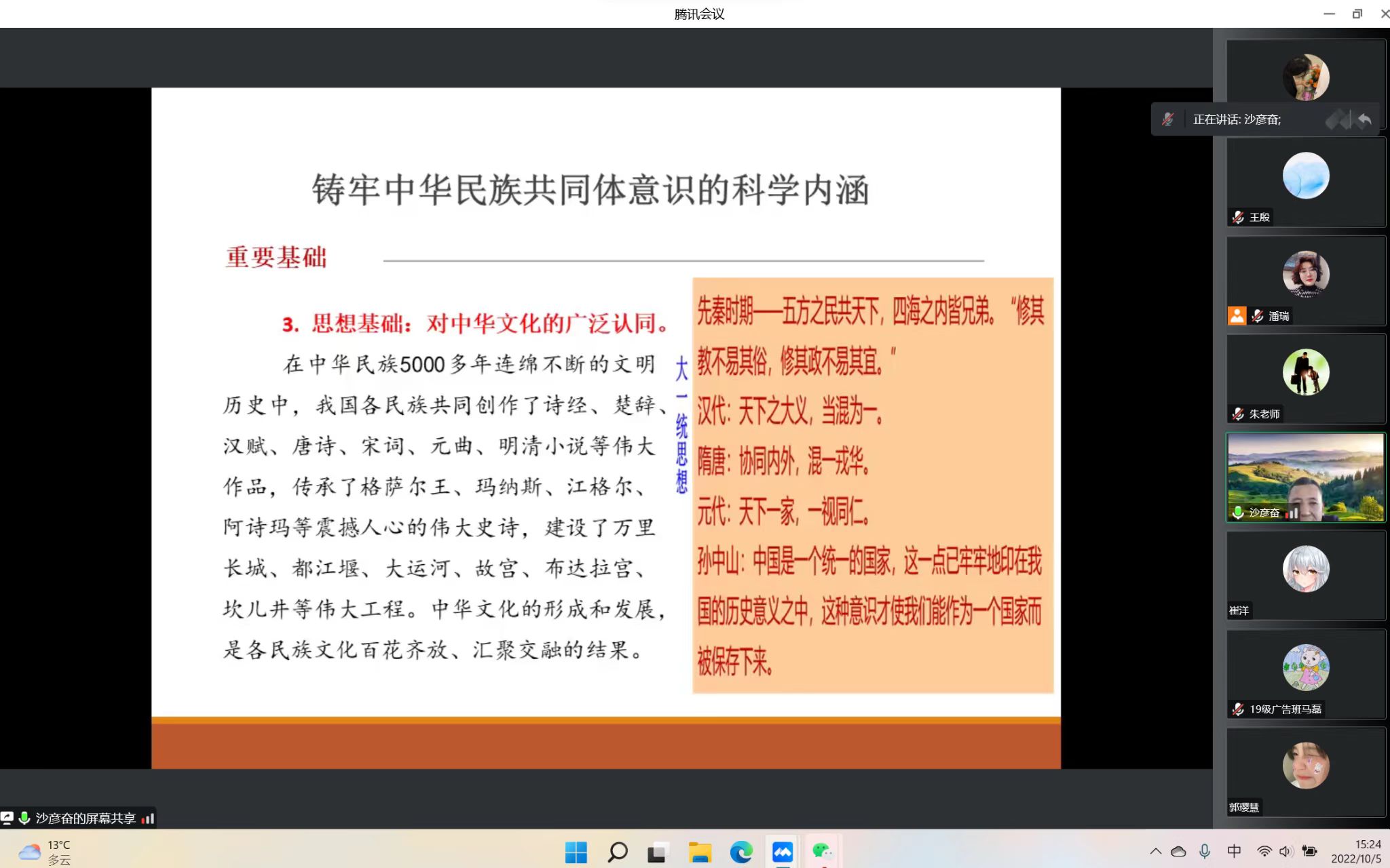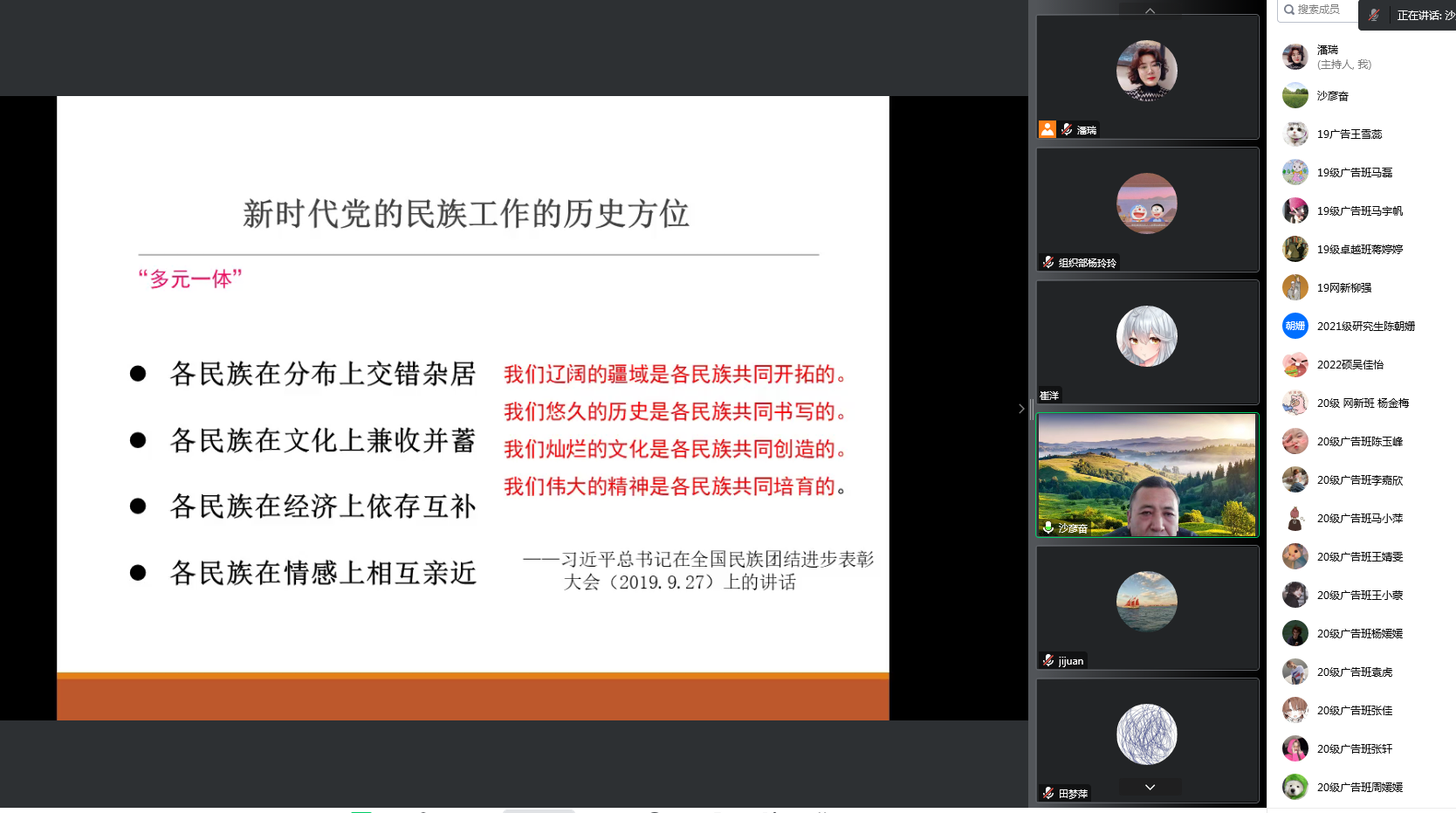 为培养学生的爱国情怀、激励全体师生振奋精神、夯实铸牢中华民族共同体意识根基,10月5日下午,我院开展了主题为“把握历史方位,铸牢中华民族共同体意识”的线上党课培训。讲座由回族研究院副教授沙彦奋主讲,赚钱游戏