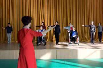 “王团,你咋今天(头发)绞(剪)成这样?很时髦呀!”“时髦得很!”团员们开起了玩笑。大家口里的“王团”,穿着一身红色长裙,棕色短卷,显得很时髦。听着大家的调侃,坐在轮椅上的她开心地笑着。