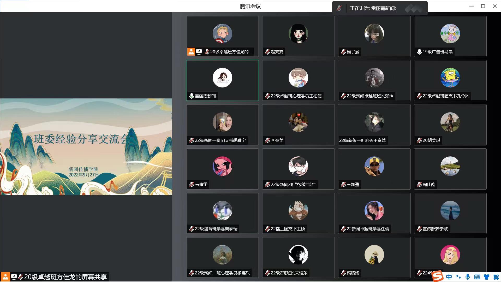 为帮助新生班委尽快熟悉工作,提升班级工作质量,9月27日晚,我院召开班委经验分享线上交流会。学生工作办公室主任雷丽霞出席会议,2020级、2019级班委代表及2022级新生班委参会,会议由学生会轮值主席马磊磊主持。