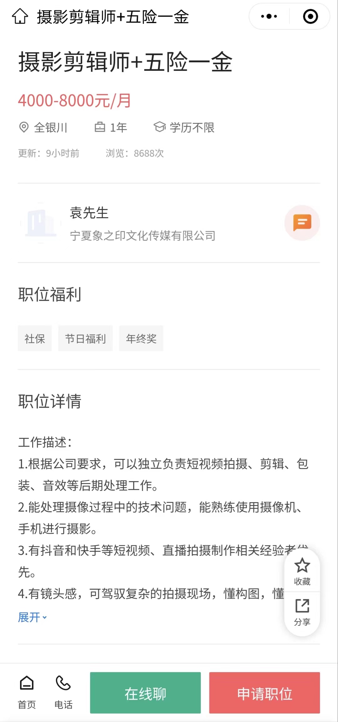 岗位:摄影剪辑师(五险一金)