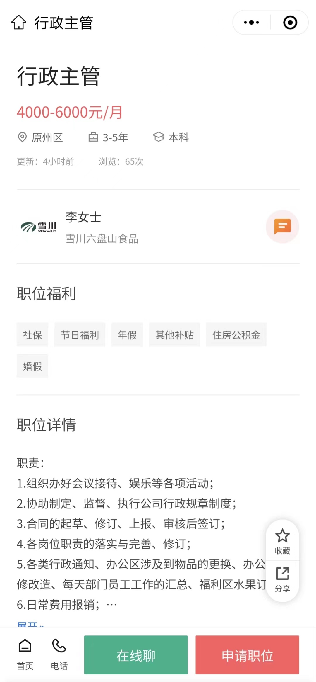 岗位:行政主管