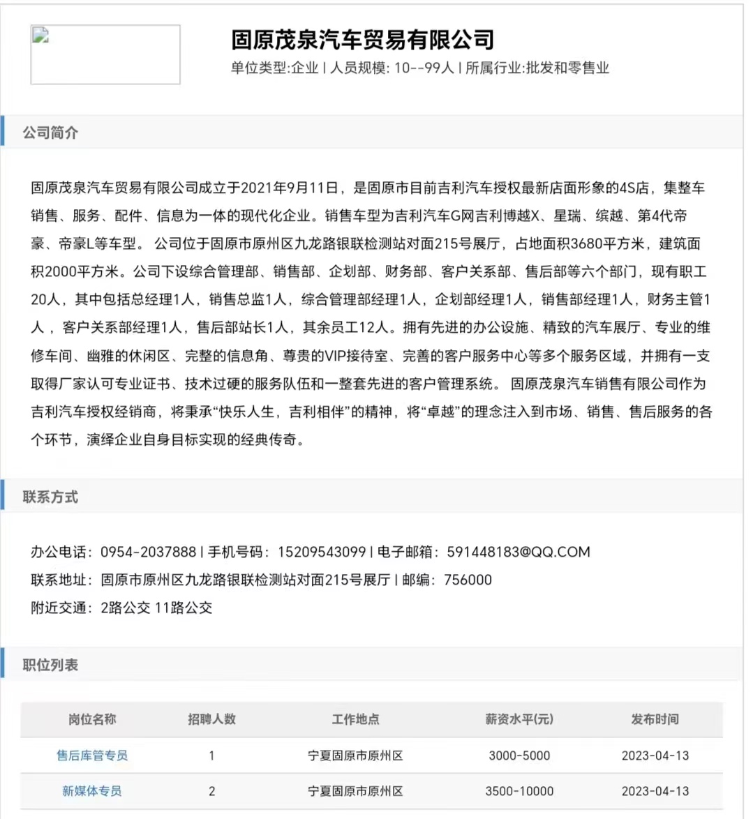 公司:固原茂泉汽车贸易有限公司