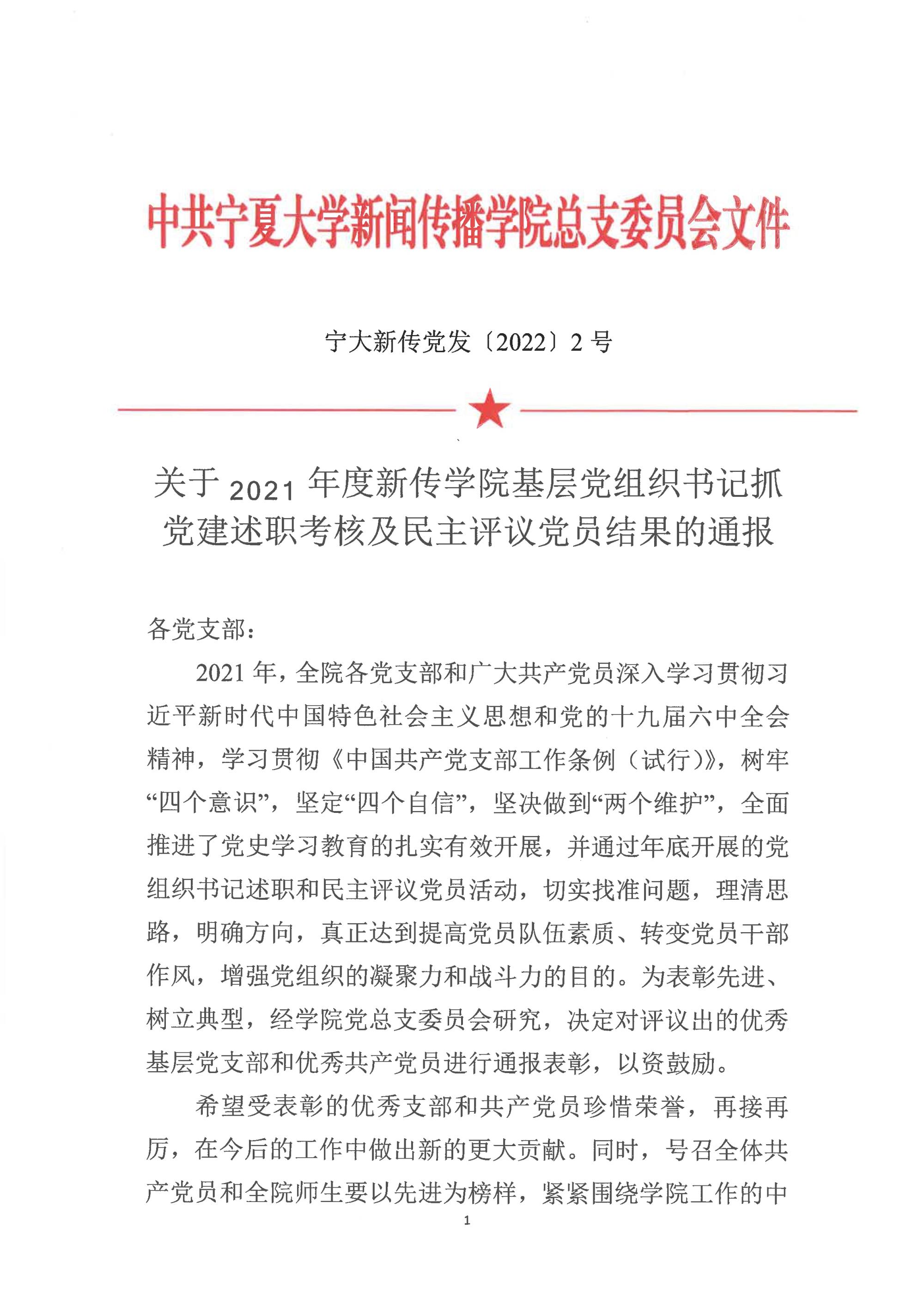 宁大新传党发〔2022〕2号 关于2021年度新传赚钱游戏 基层党组织书记抓党建述职考核及民主评议党员结果的通报