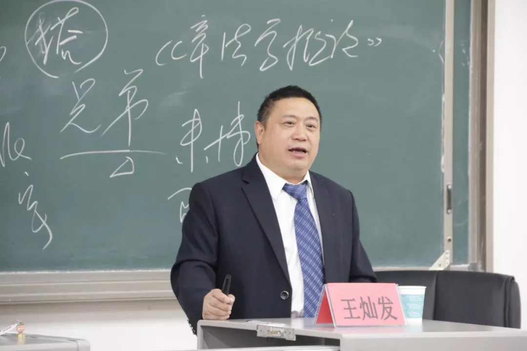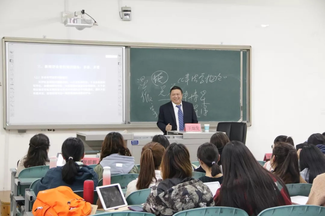 教授,博士生导师王灿发教授及其助理刘年辉教授于文荟楼411教室开展以“改革开放四十年新闻评论的发展”为主题的学术研讨会。本次研讨会由我院谢明辉教授主持,部分老师和19级全体研究生参加。