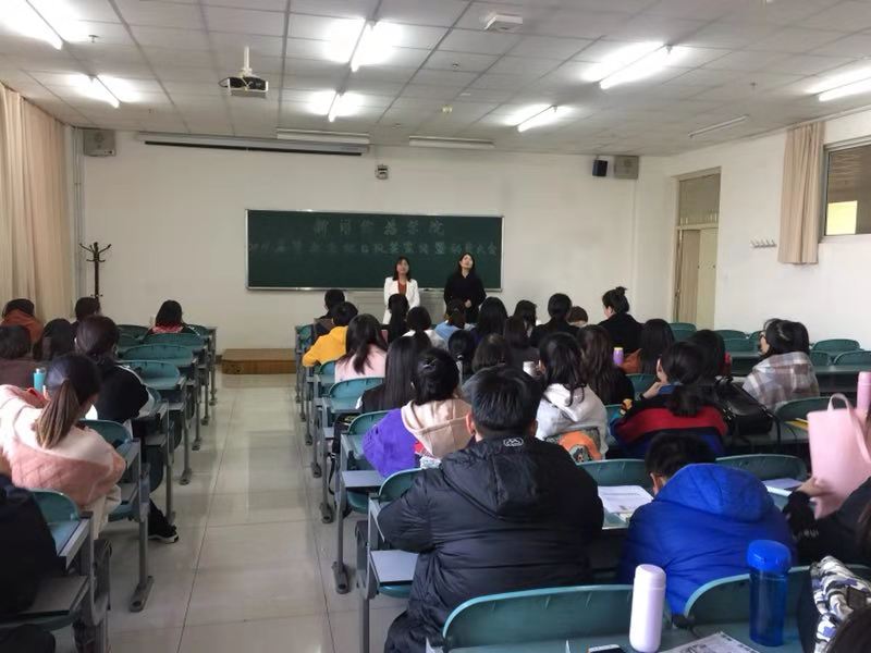 副书记马骏老师向同学们简要分析了当前就业形势,对公务员招录、事业单位招考、企业招聘、大学生基层服务项目和大学生创业等做了介绍,鼓励同学们增强信心,诚恳踏实,在实践中磨练、提升自我。辅导员雷丽霞为毕业生梳理了大四一学年的重点工作,就毕业生的重修补考、学分审核、求职资料的准备与毕业论文的答辩事项做了相关提醒,对《就业协议书》如何使用做了详细说明,并对毕业生户口、档案、组织关系的转递流程做了解释,她提醒我院关注学校就业信息平台,明确目标,提前做好就业准备,把握时机,到国家需要的岗位、领域,实现人生价值。