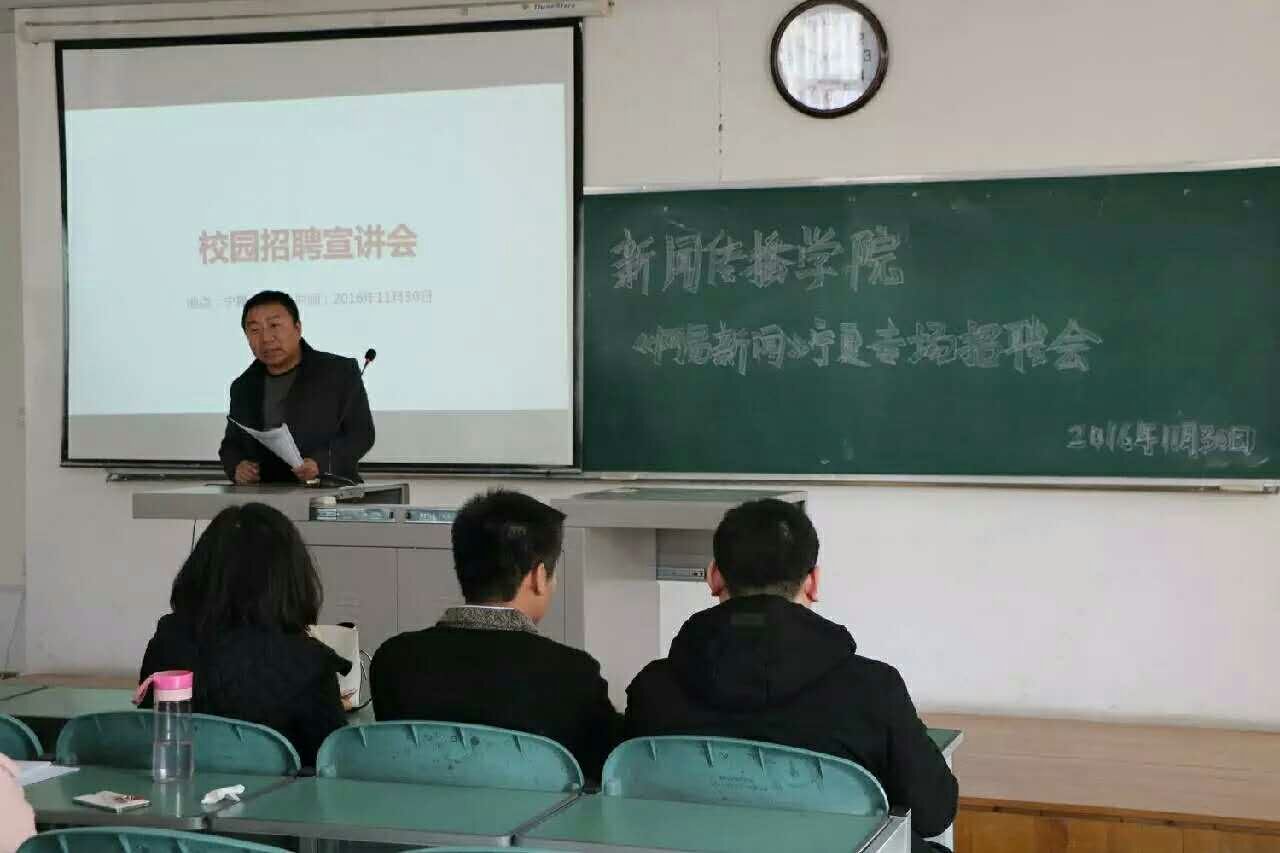 2016年11月30日,以“做有态度的新闻,建有态度的门户”为原则的中国四大门户网站之一的“网易新闻”在宁夏大学文科楼132教室开展专场招聘宣讲会,宣讲会由李瑾老师主持。