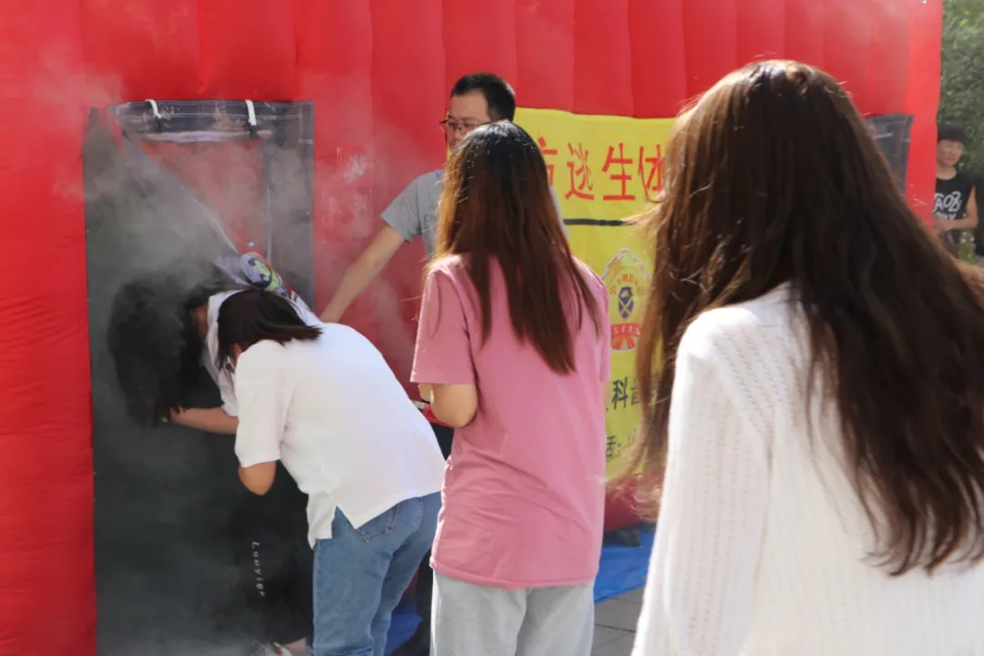 在消防演练中,同学们每八人一组进入模拟火灾现场进行逃生,直观体验当火灾来临时如何灭火自救。演练伊始,因对环境不熟悉加逃生技能掌握不熟练,很多学生找不到正确逃生出口,以失败告终。稍后同学们有意识运用讲座中所学知识,用湿毛巾捂住口鼻,弯腰前行,在浓烟中寻找正确逃生路线。最佳表现小组仅用二十秒便成功逃生。通过此次演练,同学们真实地感受到了消防减灾的重要性。