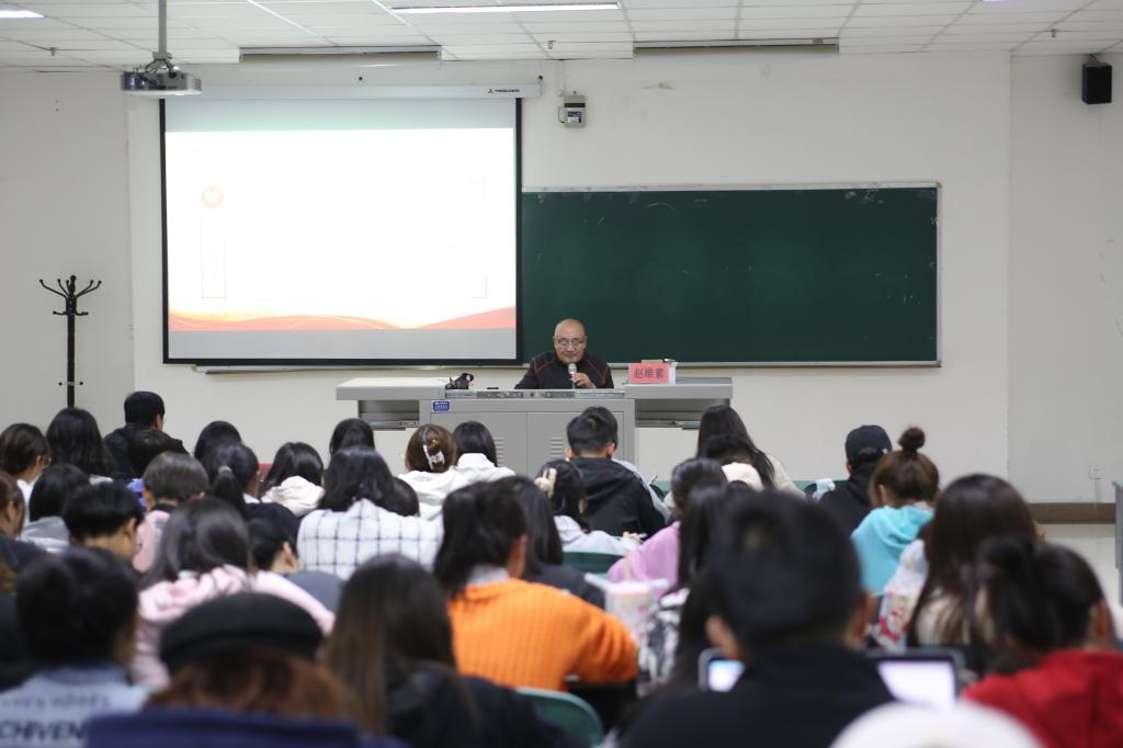 随后赵维素阐述并解释了习近平总书记在讲话中的庄严宣告,他指出这是一个历史重要标志。中国共产党的诞生标志着中国人民从百年囚笼进入了觉醒时代。革命途中涌现了一批批英雄先烈,他们用行动诠释了“为有牺牲多壮志,敢教日月换新天”的豪情壮志,在不懈奋斗中完成了开天辟地的救国大业、改天换地的兴国大业、翻天覆地的富国大业、惊天动地的强国大业四个伟大成就。“青年人要以实现中华民族伟大复兴为己任,增强做中国人的志气、骨气与底气。”随着讲座渐入高潮,赵维素高歌一曲《抬头望见北斗星》,对党进行深情告白,并勉励广大青年牢记初心使命,坚定信念,砥砺前行。