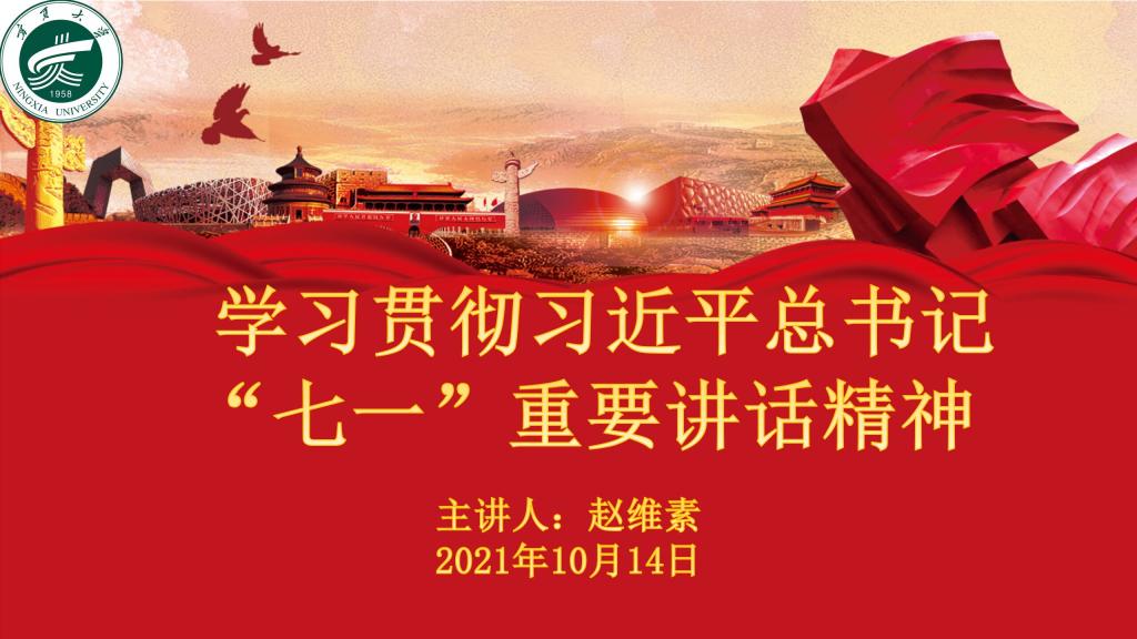 为进一步学习贯彻习近平总书记“七一”重要讲话精神,把握讲话重大意义,10月14日晚,我院于文荟楼130教室举办“学习贯彻习近平总书记‘七一’重要讲话精神”专题讲座。本次讲座由宁夏大学关工委主任赵维素主讲,我院党总支书记周强主持,全体在校党员及积极分子参加。