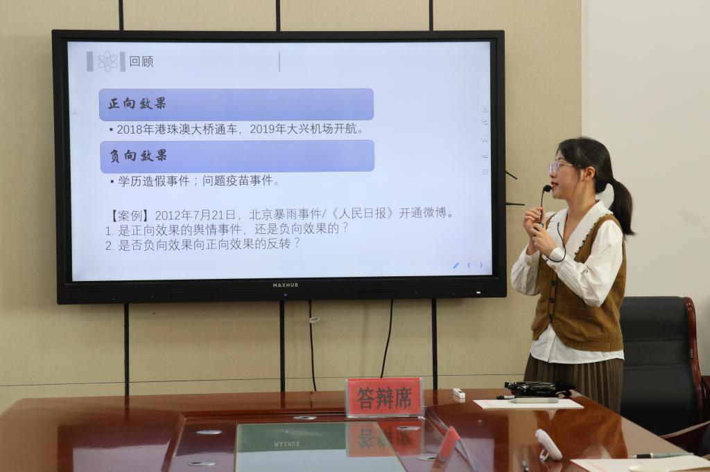 本次比赛以“上好一门课”为竞赛理念,由教学设计、课堂教学和教学反思三部分组成,课堂教学比赛环节参赛老师按照抽签顺序进行了20分钟的授课。杨璠播放电影片段,对比内容后引出了蒙太奇的具体概念,并从《火车进站》、《一个美国消防员的生活》、《一个国家的诞生》三部影片入手,突出表现固定镜头到多个镜头的拼接、转场的转变,展示线性叙述到综合运用蒙太奇的变化,介绍了蒙太奇的产生与发展,概述其作用与意义;王雅蕾从“虐猫”、“铜须门”等11个事件入手,以案例分析的方式阐述了正向效果与负向效果,从原因、影响、应对三个方面展开叙述网络舆情传播效果的反转。徐舒则以人物经历、家庭背景为线索,详细介绍第一个家喻户晓的女作家冰心。同时,重点讲解冰心在《晨报》与《小说月报》两个阶段的经历,强调了这两阶段对冰心的成长有着重要作用,并对冰心的写作特点与写作问题深度剖析。教师们精彩的展示结束后,各位评委从教学设计、课堂教学和教学反思三个维度进行评价。“教学内容要精、明、清、显,层层深入,这样才能够提起同学们的兴趣,引发思考。”赵智宏强调,教师要严格遵守比赛要求,将学情分析、思政教育与理论联系实践相结合,强化授课内容,规范教案设计、时间安排、课堂把握,同时注重授课反思,加强自身教学能力。王岩森分析了三位教师的优缺点。他将关键字作为线索,以实际授课举例,提出建议:“教师需要厘清逻辑关系,掌握最基本的概念,真正做到从学生的角度来讲授课程。”比赛在各位评委的精彩点评中圆满结束。