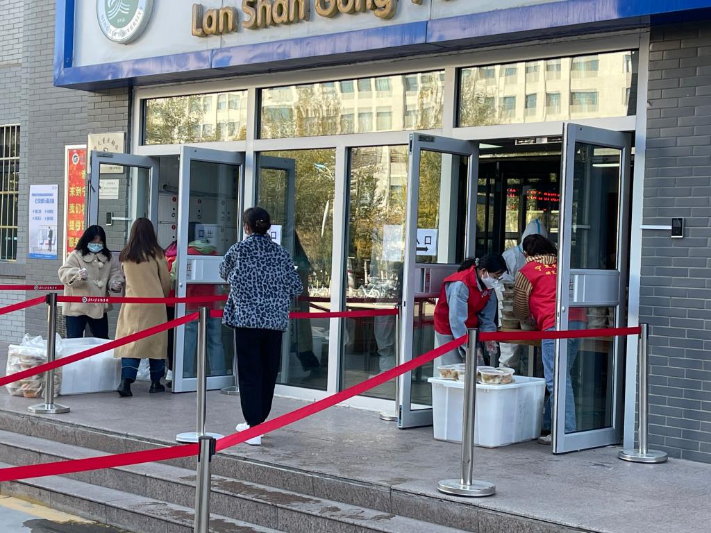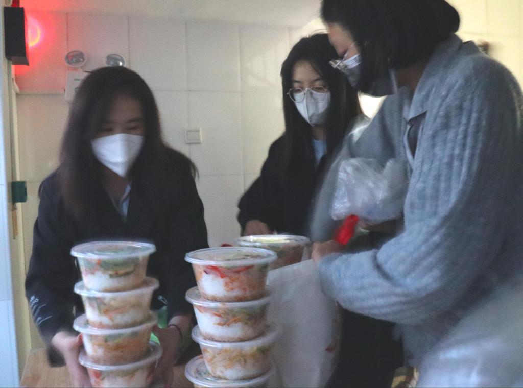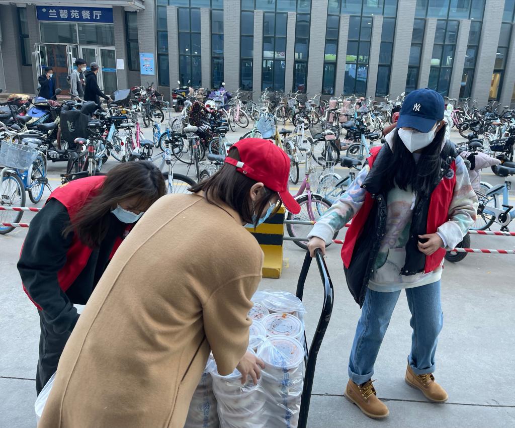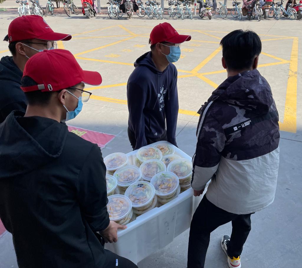 兰山公寓一号楼被封控后,楼外的同学们热情地帮助大家运送三餐,同时也提供购买生活必需品和物资、代取快递等服务,为大家的生活保驾护航,让大家安心地在宿舍生活学习。