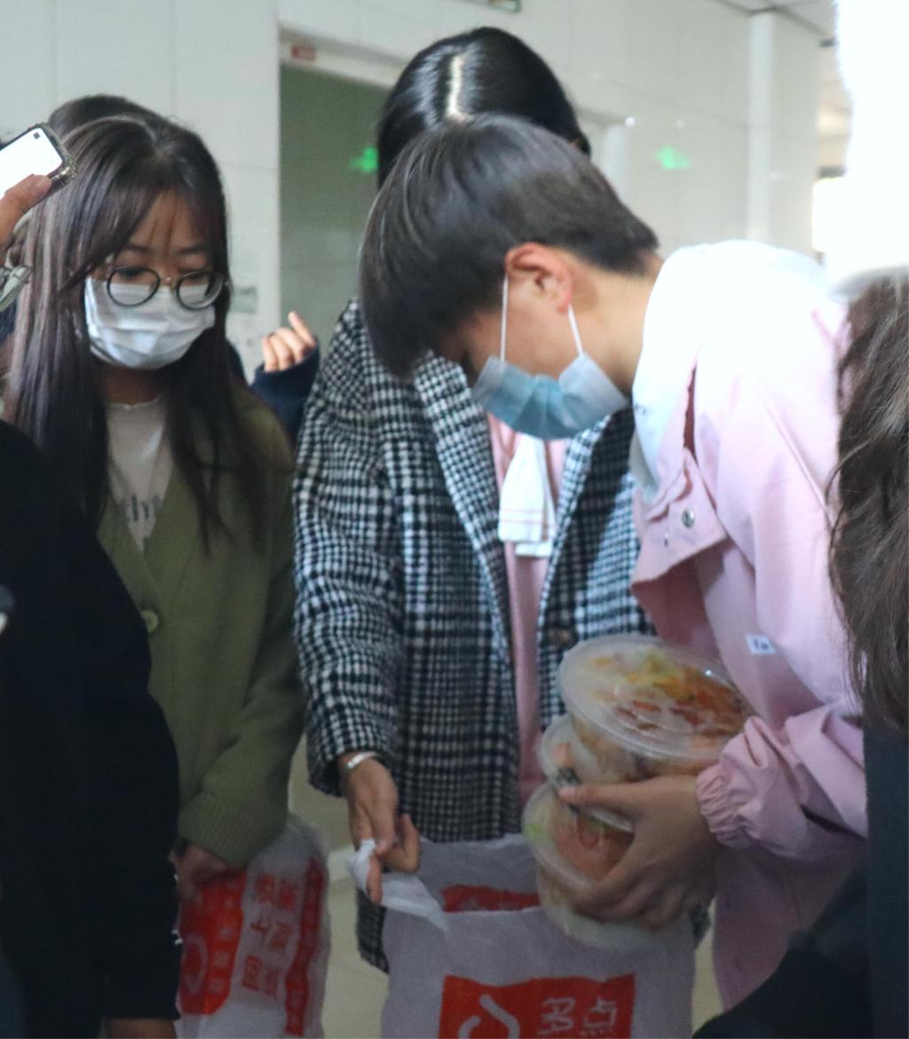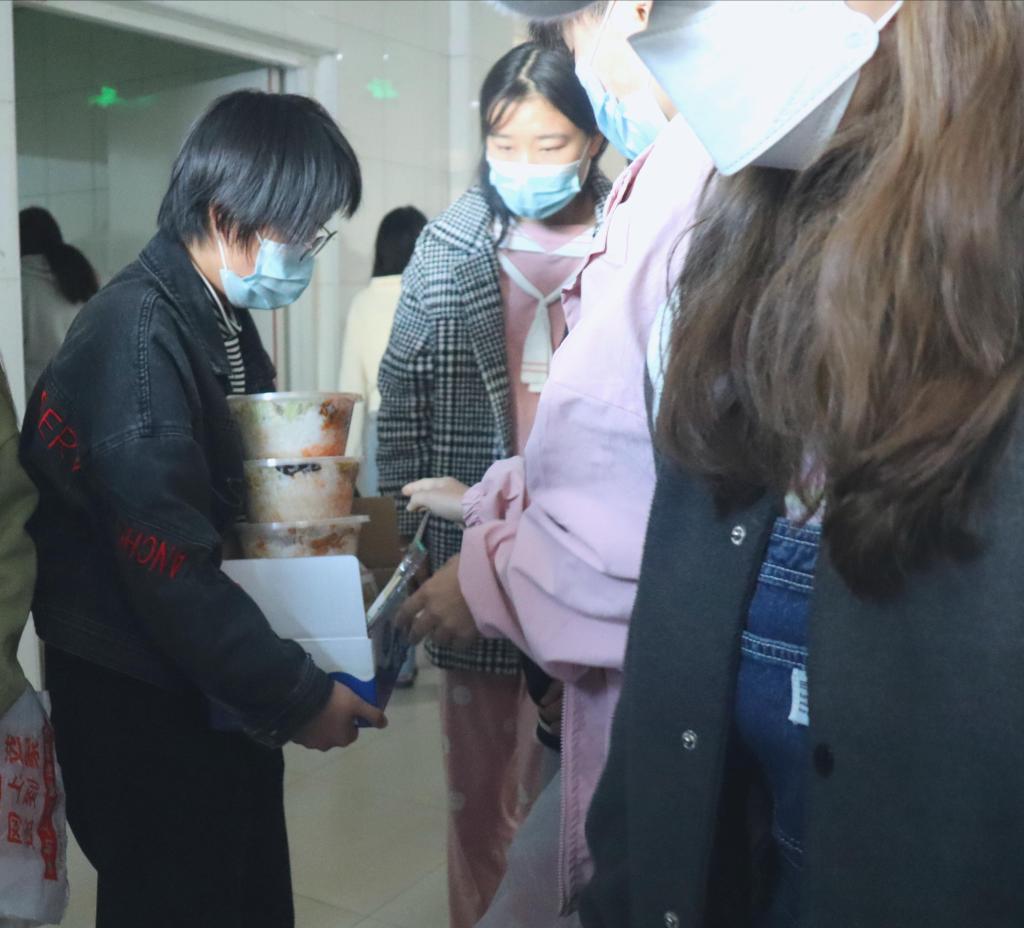 兰山一栋的同学们也并未就此停歇,她们为保障各个楼层、各个宿舍的三餐能够准确、及时地送到大家手中而奔波着。