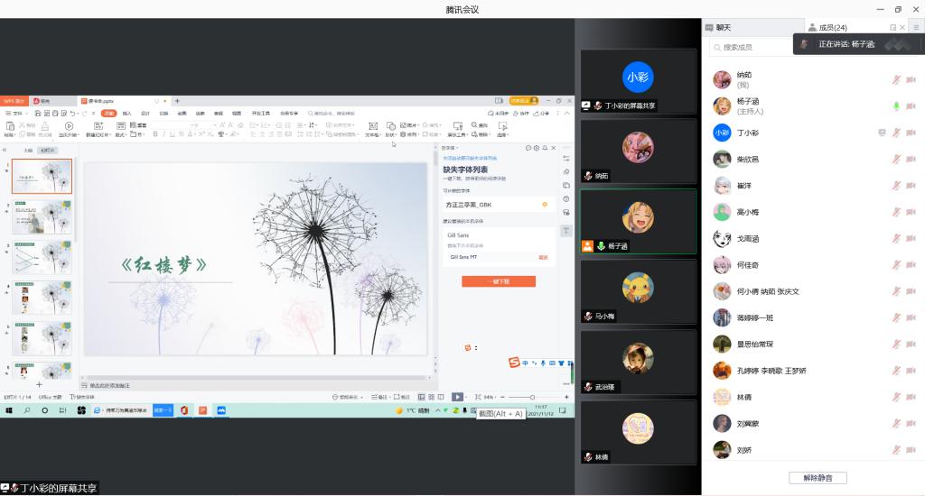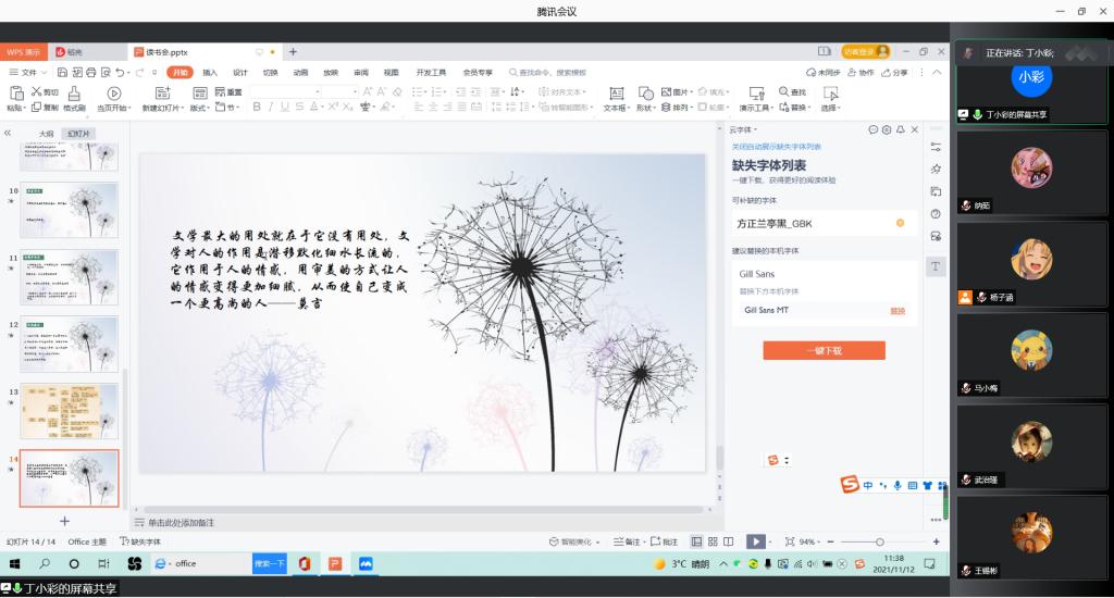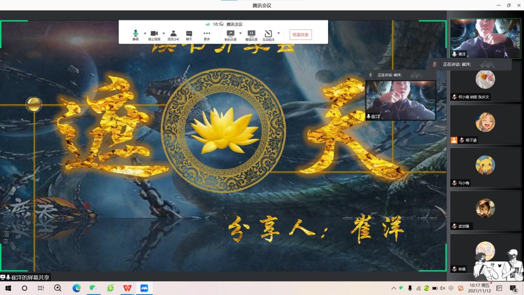 上述画面出现在11月12日上午2019级卓越新闻人才班的读书分享会上。19级卓越新闻人才班的崔洋正借助腾讯会议与大家分享最近阅读的网络小说《遮天》,同学们对他提出的问题积极思考,踊跃发言。