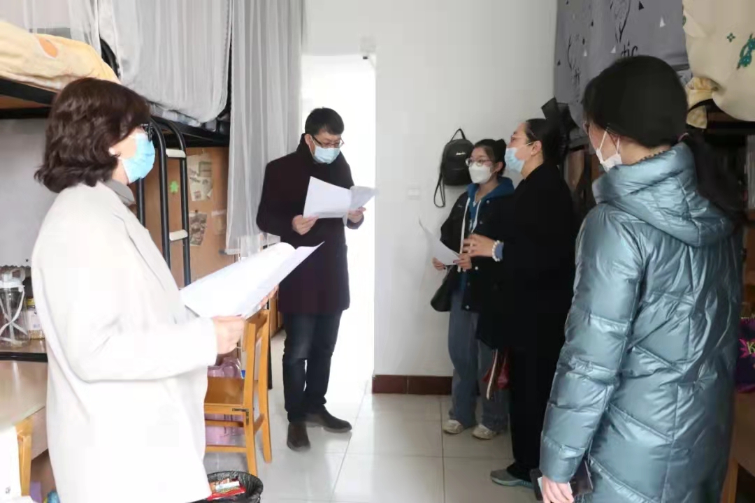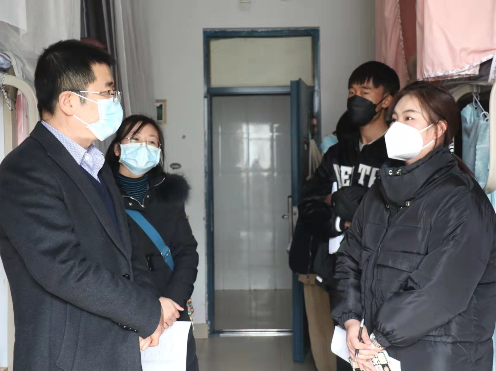 党总支书记潘瑞、党总支副书记李晓珉、副院长于鹏亮、研究生办公室秘书高燕前往怀远校区看望返校的研究生同学,并与大家进行了亲切交流,潘瑞表示:“疫情期间,大家要注意防护,保持宿舍卫生,勤通风,筑牢疫情防控常态化安全线。同时还要及时制定自己的学习和生活目标,快速调整心态,以饱满的精神状态迎接新学期的到来。”