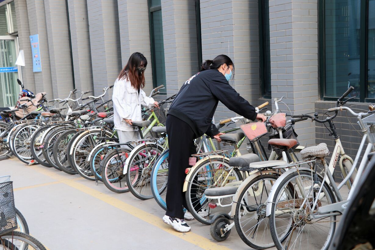 杂乱无章的自行车排排停放