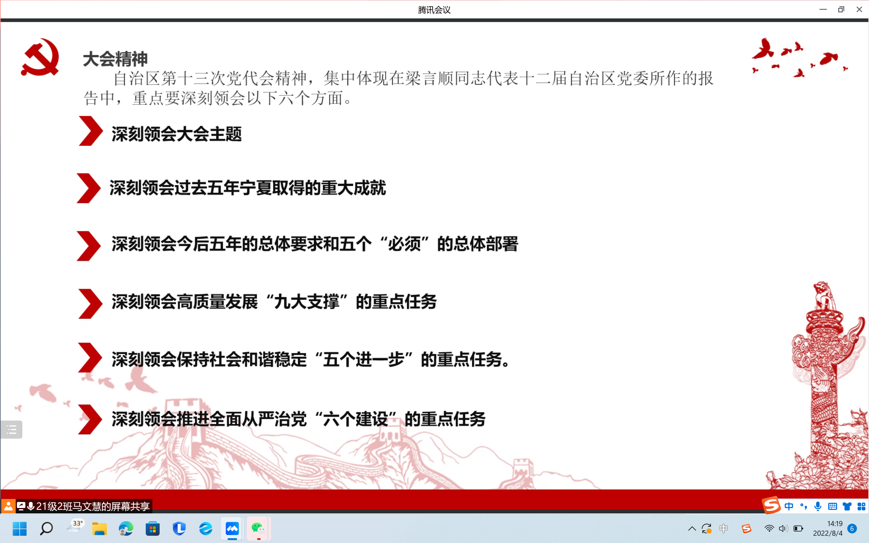 2021级网络与新媒体班团支书马文慧从大会主题、总体部署、重大成就等六方面介绍宁夏回族自治区第十三次党代会精神,详细解读会议中所提出的“学、悟、谋、行”四字决,增进了同学们对自治区党代会的了解以及对宁夏近年来发展变化的认知。