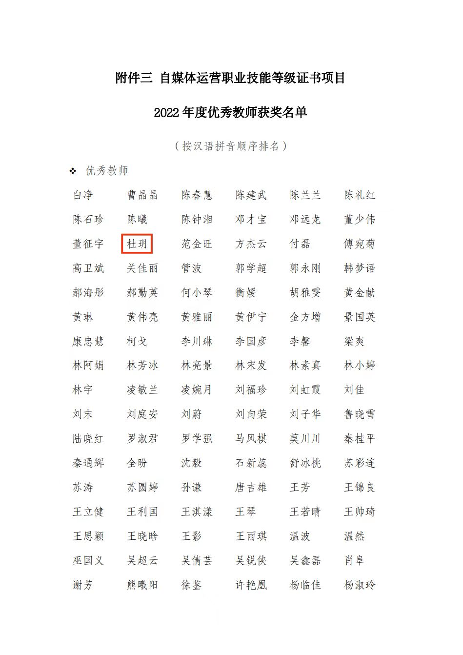 自媒体运营1+X职业技能等级证书是教育部、国家发展改革委、财政部、市场监管总局联合发起,由北京抖音信息服务有限公司(原北京字节跳动科技有限公司)认定,将产业需求和职业标准相结合,从业者能力与职业技能标准相衔接的含金量证书。此项目依据2022年度相关数据,综合考查项目对接、教学组织、考试实施、考生成绩等多个因素,采用加权计分法,经证书项目专家组审议,评出优胜学校、优秀组织单位、优秀教师、优秀学生四类奖项。