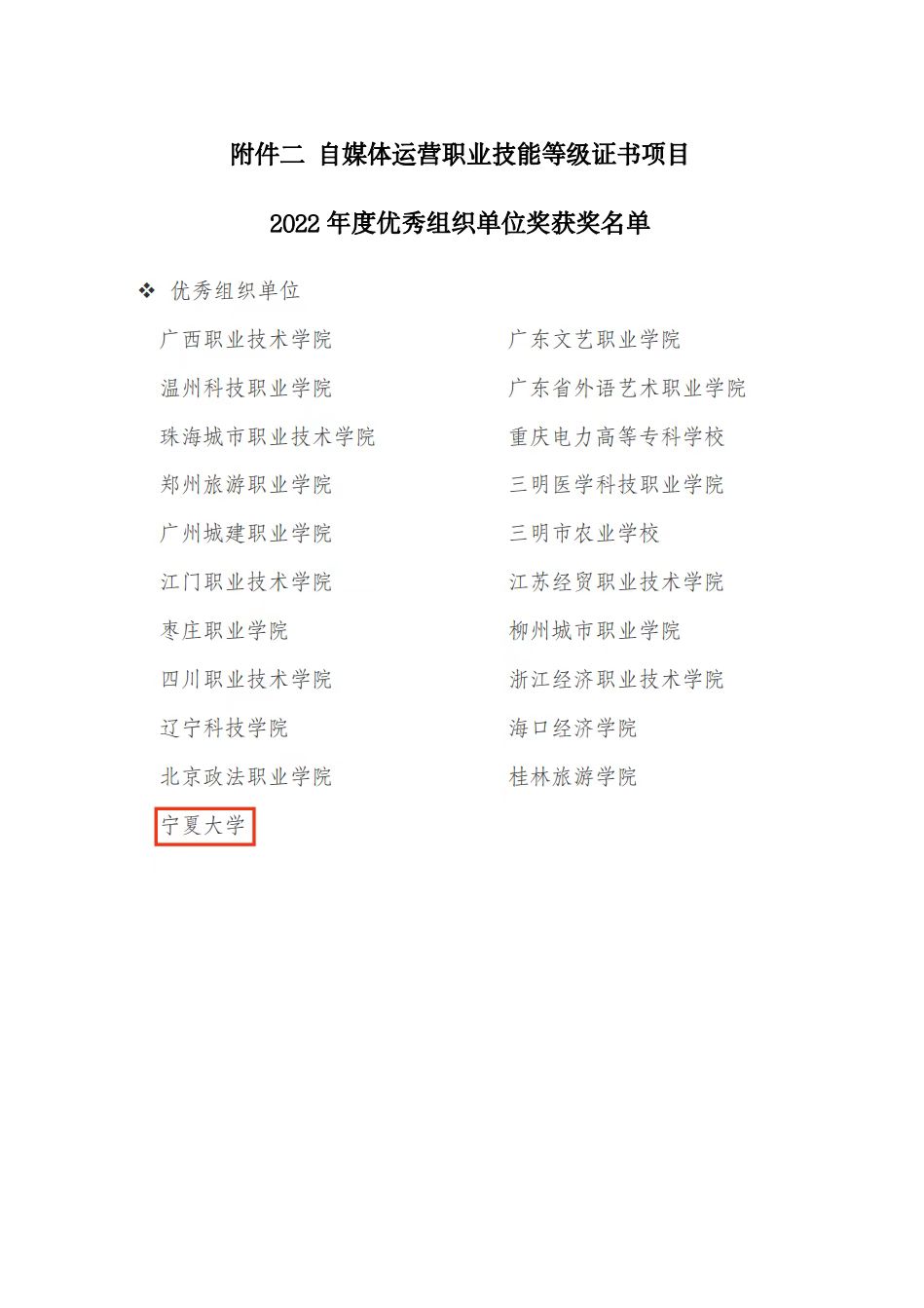 2月8日,北京抖音信息服务有限公司(原北京字节跳动科技有限公司)发布自媒体运营1+X职业技能等级证书项目2022年度获奖结果:宁夏大学荣获优秀组织单位奖,赚钱游戏