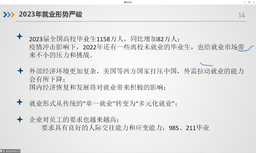 潘瑞就2022届我校及我院就业情况、2023年就业形势、就业政策三个层面给毕业生进行讲解。她指出,2022年,我院毕业生在乡村教师、国家基层项目、地方基层项目毕业去向落实率仅为15.6%,升学比例仅为9.9%,希望2023届毕业生正确认知自己,结合专业特点,到企业就业,先就业后择业。
