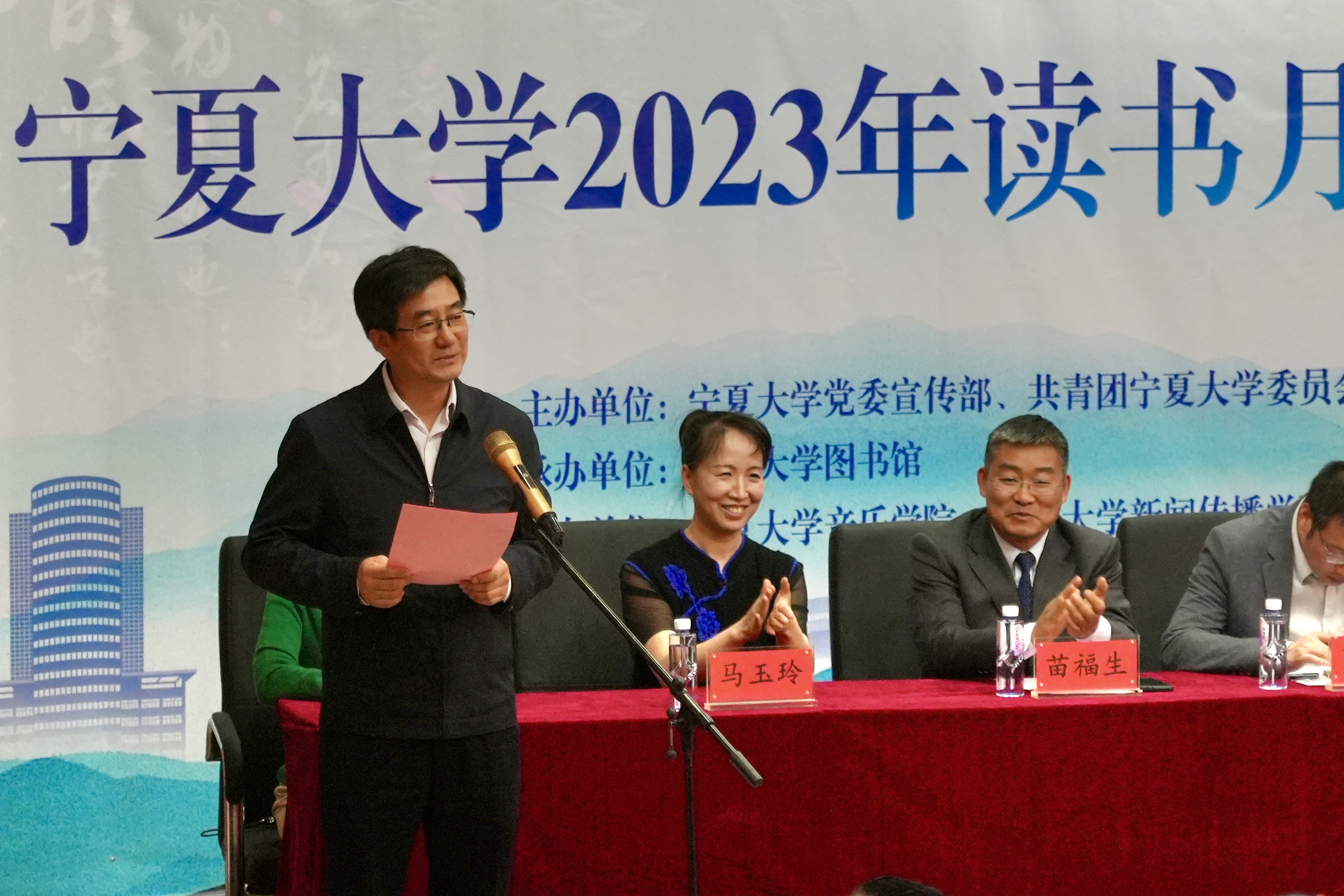 宁夏大学党委副书记周震致辞并预祝读书月系列活动圆满成功,宁夏大学图书馆馆长苗福生宣读系列活动安排,宁夏大学图书馆副馆长陆凤红宣读“阅读之星”名单并现场颁奖。其中,我院刘雪茹和杨丽坤同学获得本年度“阅读之星”称号。