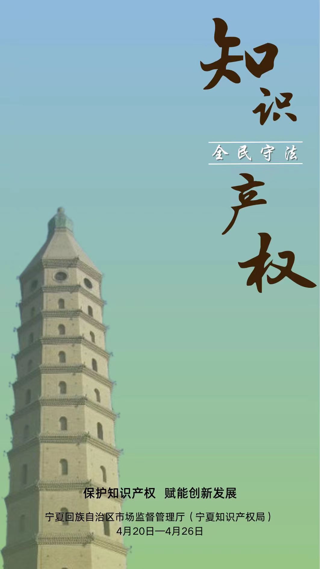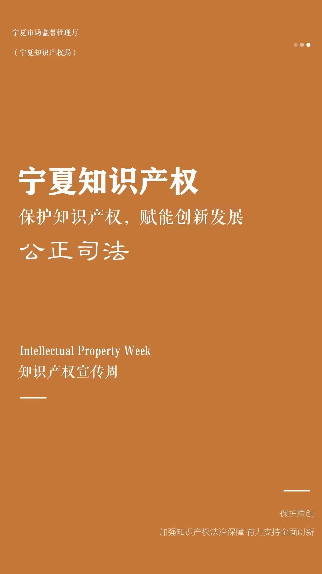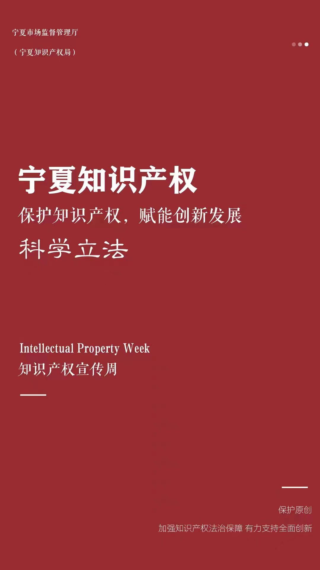 宁夏知识产权宣传周活动是宁夏回族自治区市场监管厅(知识产权局)为全面贯彻落实党的二十大精神和习近平总书记关于知识产权工作的重要指示论述,认真落实党中央、国务院关于全面加强知识产权保护的决策部署,深入实施知识产权强区战略所组织的一项重要宣传活动,旨在加强公众知识产权保护意识,提升知识产权保护水平,赋能创新发展。