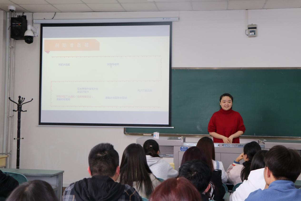 王雪蕊结合切身经历,围绕大创是什么、做大创的意义和做大创的方法等三方面深入浅出地讲解了大创项目申报的相关知识。王雪蕊认为做好项目最重要的是选题,要立足于生活,从自己擅长且感兴趣的内容入手。她结合自身实践经历,从专业学习、未来深造与自身能力提高等角度切入,向同学们展示了参与并完成大创项目的意义。同时她还谈到了近年来大创项目的新政策与新颖选题,进一步分析了申报并完成大创项目对于拓展大学生知识面广度和深度的积极作用。