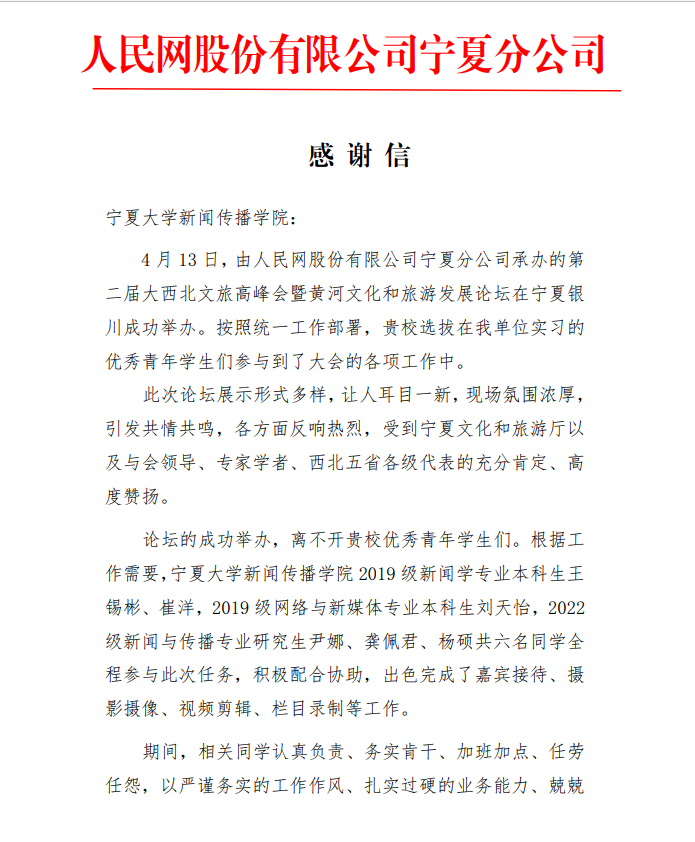 4月23日,我院收到人民网(宁夏频道)发来的一封感谢信,信中对我院今年于该单位实习的2019级本科生王锡彬、崔洋、刘天怡以及2022级研究生龚佩君、尹娜、杨硕在实习中的优异表现提出了表扬。