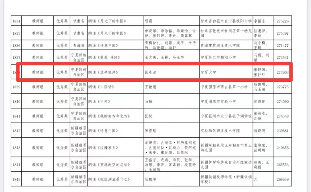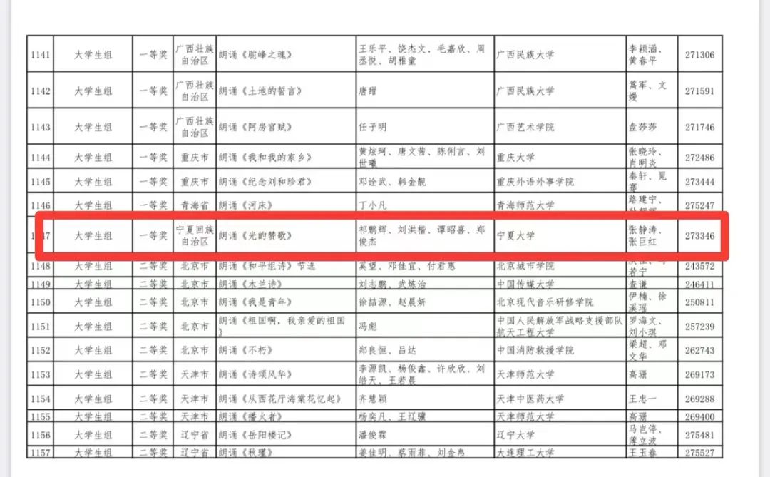 由张静涛老师、张巨红老师指导的我院22级播音班祁鹏辉、刘洪楷、谭昭喜、郑俊杰四名同学的作品《光的赞歌》荣获大学生组一等奖,我院张春波老师的作品《兰亭集序》荣获教师组优秀奖。同时,宁夏大学还荣获留学生组一等奖、教师组三等奖、教师组优秀奖、留学生组优秀奖各1项。其中大学生组一等奖、留学生组一等奖双双取得“零”的突破,这是宁夏也是宁夏大学获得历史性最好成绩。