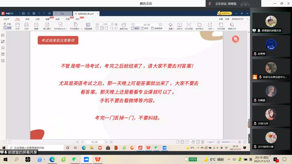 疫情防控期间,同学们面临更紧迫的学习任务,尤其对于考研生来说,本不风顺的考研路似乎又多了几分挑战。但在这次讲座中,主讲人们细心地为学弟学妹们传授经验,大家在热烈的互动中逐渐明晰了目标,坚定了考研的决心。讲座最后,同学们纷纷表示在这条一“疫”孤行的路上,自己会克服困难,珍惜时间,不负韶华。