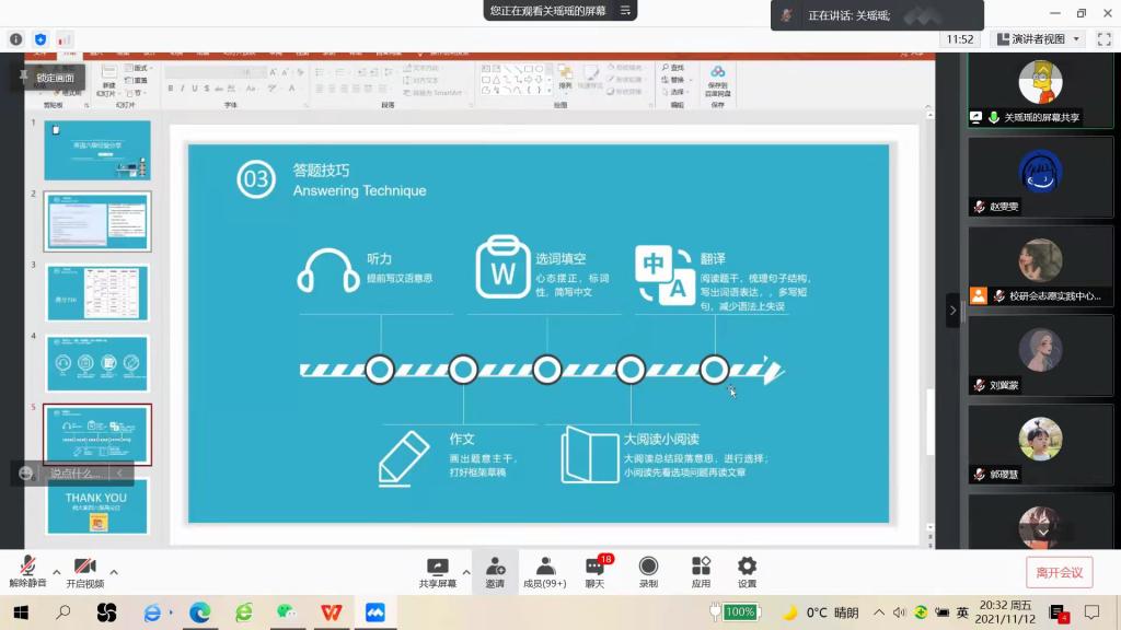 接着关瑶瑶介绍自己英语六级考试的经验,建议同学们重视听力和阅读,一定要做到多看多讲,把自己放进英语环境中学习。他还强调了真题的重要性,叮嘱大家把往年的真题练熟才能够找到试题规律,在潜移默化中锻炼自己的思维度,正所谓“知己知彼,方能百战不殆”。其次他还指出,制定科学合理的复习计划是成功之本,考研路似高考但又不像高考,自主学习要求更高,备考内容冗杂且晦涩难懂,这就要求同学们要有“千里之行,始于足下”的学习精神,要在潜心挖掘中找到自己的方法,并在科学的学习规划中坚持不懈。